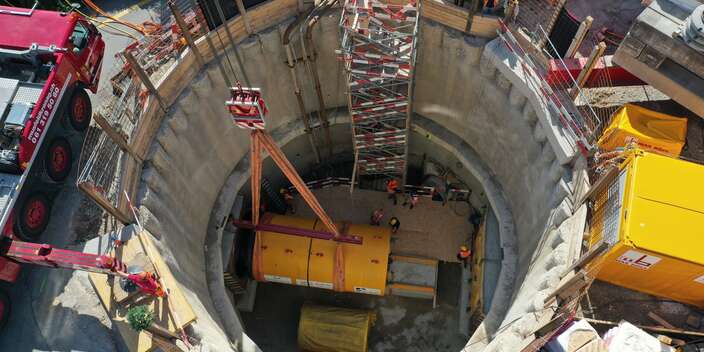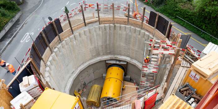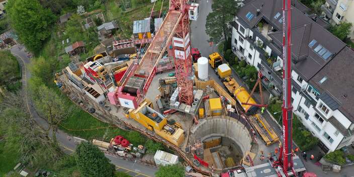 Am Vortag, dem 15. April 2025, wurde die TBM auf die Baustelle transportiert und in die vorgesehene Baugrube eingehoben. Die vorgängig erstellte Baugrube mit einer Bohrpfahlwand als Baugrubensicherung weist einen Durchmesser von ca. 12 Metern und eine Tiefe von ca. 14 Metern auf. Der Einhub der TBM erfolgte mit einem Pneukran und unter Vollsperrung der Eierbrechtstrasse.