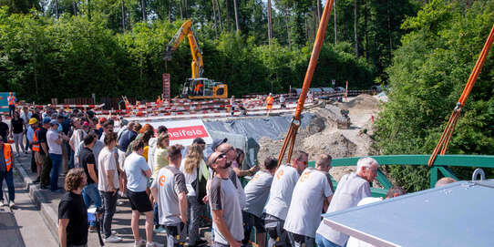 Am Donnerstag, 12. Juni 2025 konnte ein wichtiger Meilenstein mit dem Brückeneinhub bei dem Projekt Zulaufkanal Wülflingen in Winterthur erreicht werden. Die rund 42 Tonnen schwere und 35 Meter lange Stahlbrücke wurde bei perfektem Wetter und bester Stimmung im Projektteam und den zahlreichen Zuschauern an ihren Standort über der Töss versetzt – mithilfe eines der grössten Pneukrane der Schweiz. In Kürze wird die Stahlkonstruktion das gesamte Abwasser der Stadt Winterthur über zwei Stahlrohre mit einem Durchmesser von 1400 mm zur ARA Hard leiten. Als Projektverantwortliche bedanken wir uns bei allen Beteiligten für die hervorragende Zusammenarbeit!