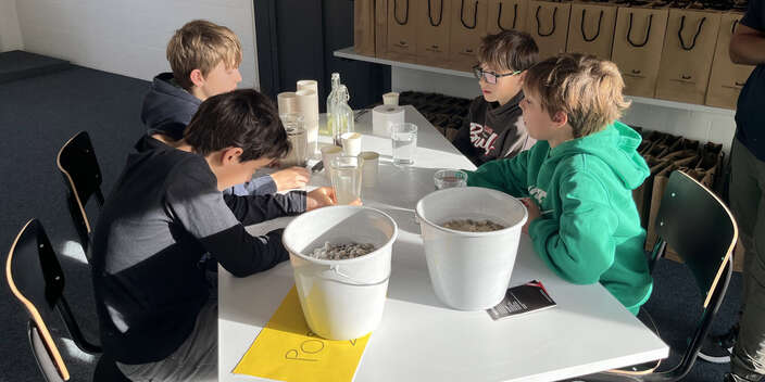 Die 11 Jungs tauchten mit unserem Wimmelbuch in die Abläufe einer Kläranlage ein. Beim anschliessenden Postenlauf setzten sie sich mit 2D-Plänen und 3D-Modellen von Kläranlagen auseinander und führten ein Experiment durch, um zu beobachten, wie sich Steine, Sand, Öl, Papier und Sirup im Wasser verhalten. Gemeinsam leiteten wir daraus ab, wie diese Stoffe in einer Kläranlage wieder entfernt werden können. Am Nachmittag folgte eine Führung durch die ARA Hard, bei der die Kinder die einzelnen Reinigungsstufen Schritt für Schritt kennenlernen durften.