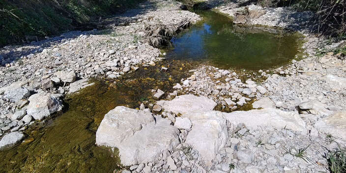 Mit einer geformten Niederwasserrinne wird der geringe Trockenwetterabfluss von 80 l/s (Q347) auf einen kleinen Bereich in der Sohle konzentriert. So wird die Verdunstungs- und Versickerungsoberfläche deutlich verkleinert. Durch Beschattungsmassnahmen wird das Wasser vor direkter Sonneneinstrahlung und somit auch vor dem Erwärmen geschützt. Mit Lehm abgedichtete und komplett beschattete Pools bilden auch bei noch geringerem Abfluss Rückzugsmöglichkeiten für Fische.