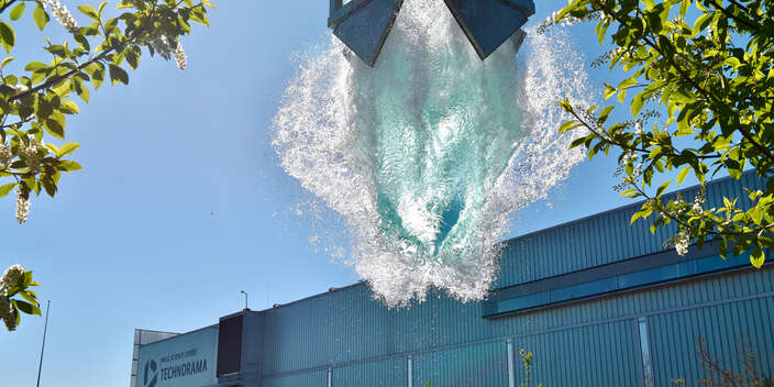 Über den ganzen Park spannt sich die 130 Meter lange Wunderbrücke mit einem Gefälle von 5%, welche zusammen mit dem Schweizerischen Ingenieur- und Architektenverein (SIA) entwickelt wurde. Von dieser fällt der grösste Wassertropfen der Welt mit 5m³ rund 10 Meter in die Tiefe, wird umgelenkt und schiesst hoch hinauf. Das Wasser für die Exponate wird im Kreislauf gepumpt und in einem mehrstufigen Verfahren wieder aufbereitet. Tönt kompliziert? Auch hier kommt unsere Firma wiederum ins Spiel: Wir erstellten die Simulation der Hydraulik des fallenden Wassers.