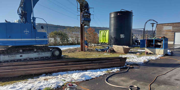 Diverse der üblich eingesetzten Geräte würden in den Gefahrenbereich der Hochspannung ragen. Dies gilt auch für das Einbringen der Spundwände. Die Spundwandbohlen müssen auf der ARA Bachwis mit einem Bagger in zwei Teilen eingebracht und vor Ort in der Mitte zusammengeweisst werden. Um diese komplexe Aufgabe zu meistern, wurden im Rahmen des Bauprojekts Tests erfolgreich durchgeführt.