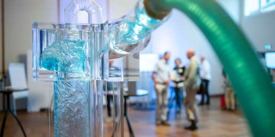 An unserem Kundenanlass «Blaue Zukunft: Wenn Algorithmen Wasser bewegen» konnte das Modell begutachtet werden – das Interesse war gross, die Rückmeldungen durchwegs positiv. Das transparente Modell machte Strömung, Luftführung, Wirbel und die damit verbundene Ingenieursarbeit auf eindrückliche Art sichtbar.